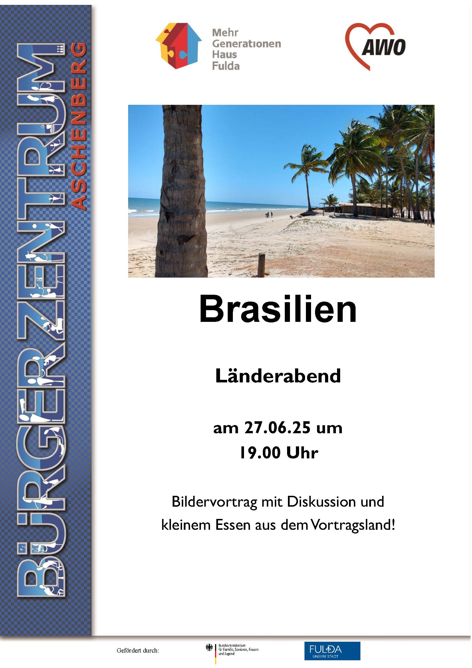 Das Mehrgenerationenhaus im Bürgerzentrum Aschenberg lädt am Freitag, 27. Juni 2025 zu einem Bildervortrag mit dem Titel Brasilien ein. Der Einlass zu der Veranstaltung beginnt um 18.30 Uhr im Bürgerzentrum Aschenberg (Aschenbergplatz 16-18). Der Eintritt ist frei, im Anschluss wird ein Nationalgericht aus dem Vortragsland gegen eine kleine Spende angeboten.