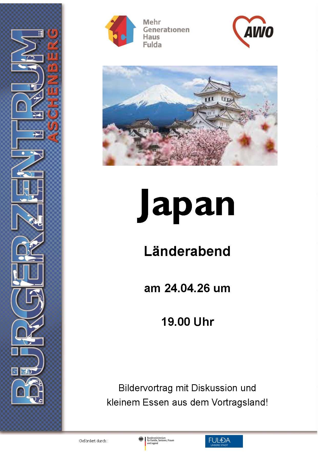 Das Mehrgenerationenhaus im Bürgerzentrum Aschenberg lädt am Freitag, 24. April 2026 zu einem Bildervortrag mit dem Titel Japan ein. Der Einlass zu der Veranstaltung beginnt um 18.30 Uhr im Bürgerzentrum Aschenberg (Aschenbergplatz 16-18). Der Eintritt ist frei, im Anschluss wird ein Nationalgericht aus dem Vortragsland gegen eine kleine Spende angeboten.